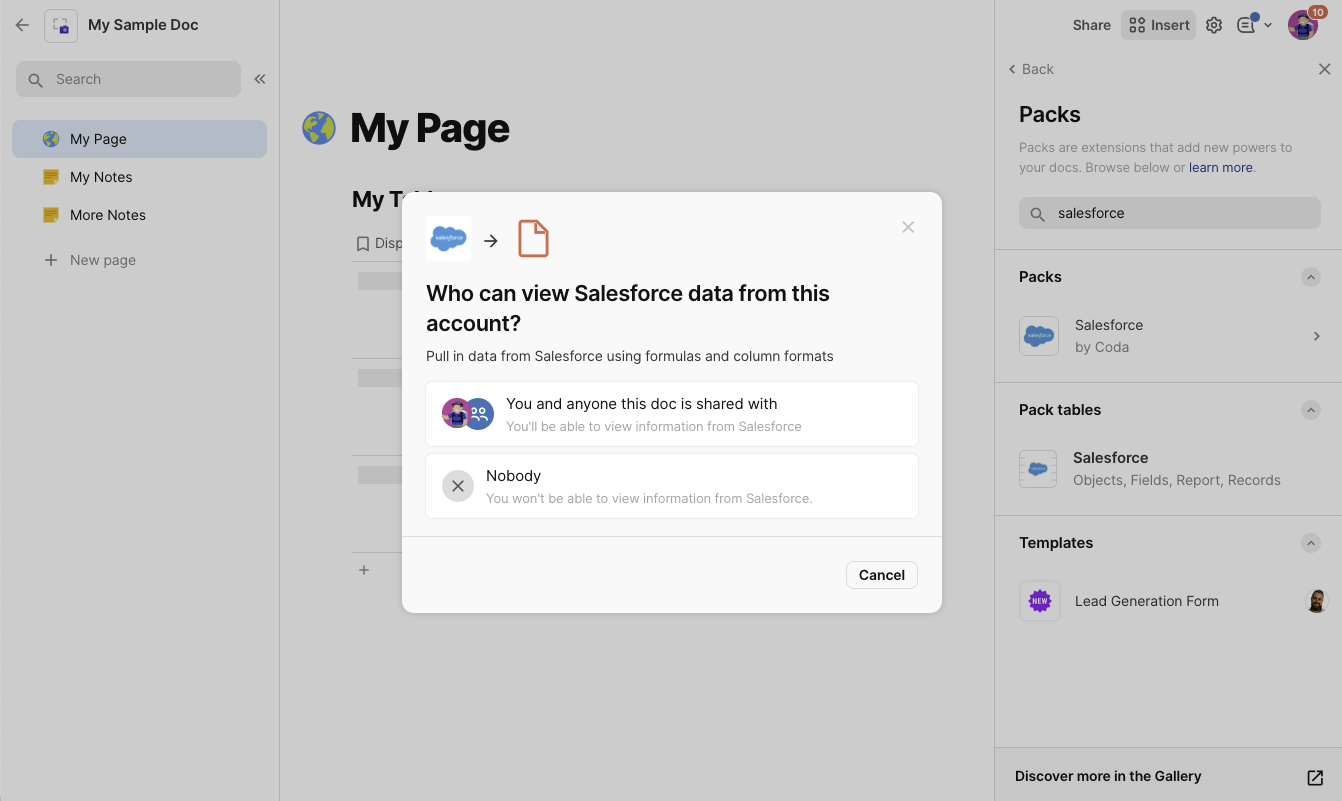You and anyone this doc is shared with is recommended and required for viewing Salesforce data in your doc. This means that if you add data from Salesforce and then share the doc, your team can see the data you added. Think of it as if you exported a SFDC report to Excel.