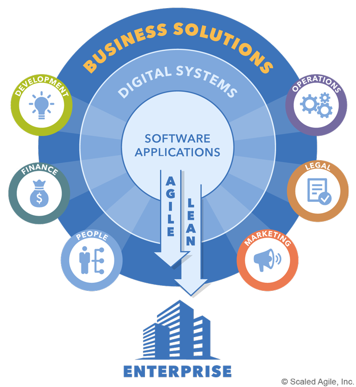 Lean-thinking people and Agile teams is the first dimension of organizational agility. This dimension is critical to delivering business solutions—not just the software applications and digital systems, but all of the supporting activities (e.g., privacy, security, support, availability) necessary to continually address the business problem. Even the solution itself is not stand alone, it lives in the larger context of its environment—including other hardware, software, network systems, and more.