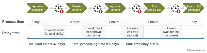 As is the case in the figure above, the delay time (the waiting time between steps) is often the biggest source of waste. If the team above wanted to deliver a marketing campaign faster, they would need to reduce the delay times, as the processing steps are only a small part of the total lead time. Reducing delays is typically the fastest and easiest way to shorten the total lead time and improve time to market.