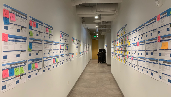 Visualize customers. Agile teams use personas to bring the customer to life and post their representations on the walls of their team area, so they are always top of mind. Visualize the flow of work. Making the current work visible using Kanban systems exposes the amount of Work In Process (WIP), bottlenecks, and what people are really doing as opposed to what others think they are doing. Visualize solution health. Customer support teams have long seen the value in displaying the number of waiting calls, daily closed and open tickets, and current Service Level Agreements performance prominently on monitors close to the teams who rely on that information. This approach has been adopted by Agile teams to include metrics on the state of the current solution. Visualize strategy. Another example of visualizing work is an ‘investment corridor’ (Figure 4) that identifies all current and potential epics in flight. Rather than confining the portfolio visualizations to a room, information in the corridor is outside, making it easy for people to walk up and add their thoughts and suggestions.