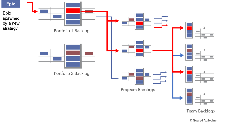 Figure 9 illustrates how new epics go through the various Kanban systems and backlogs that manage the flow of work. During the normal course of work all backlogs are continuously reprioritized. Kanban systems help changes in strategy move quickly across value streams to the teams who do the implementation. This way, execution is aligned—and constantly realigned—to the evolving business strategy.